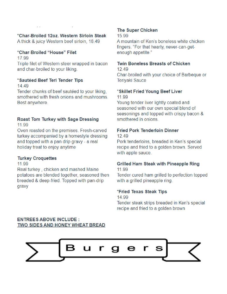 Welcome to Ken's Restaurant, a beloved gem nestled in Skowhegan, Maine, specializing in delicious sandwiches, fresh seafood, and classic diner fare. Known for its welcoming atmosphere and friendly staff, this casual dining spot is perfect for everyone—from families to groups of friends. Whether you're craving a hearty Lobster Roll at $14.25 or the satisfying Broiled Haddock for $14.99, each dish is crafted with care and offers generous portions at reasonable prices.